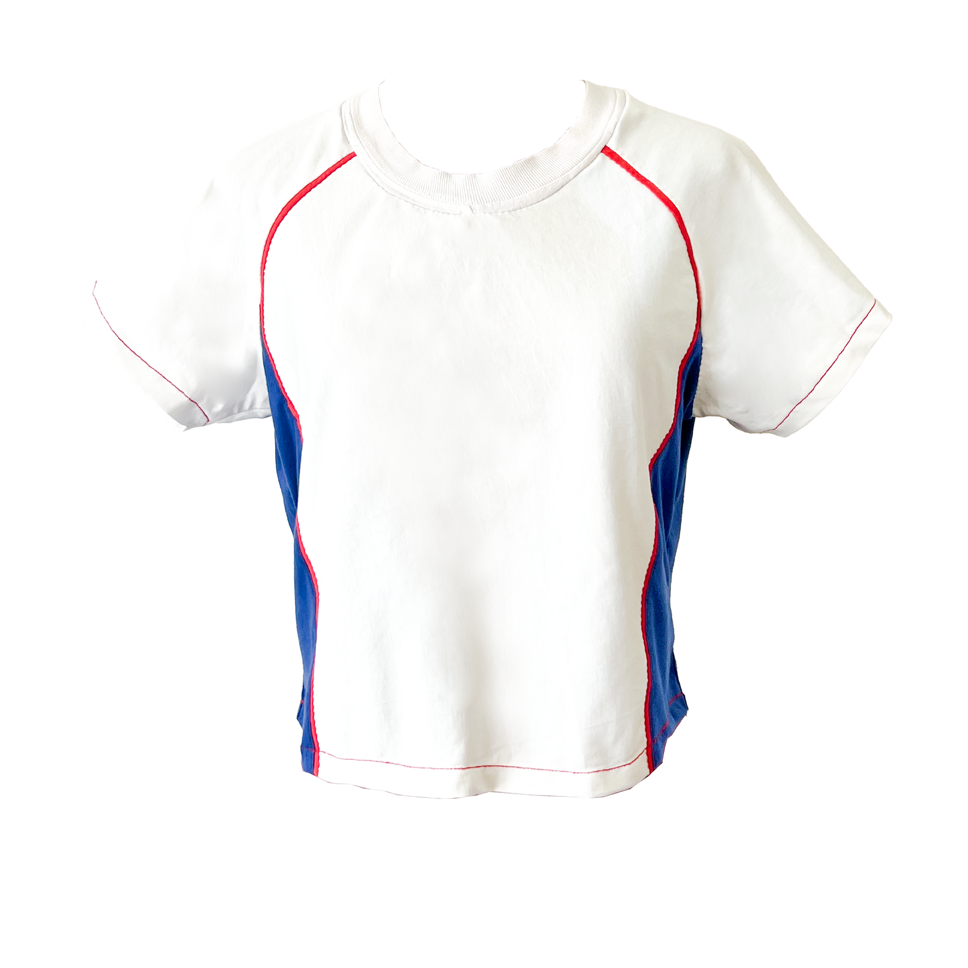Sporty cut, contrast panels, one-of-a-kind feel.